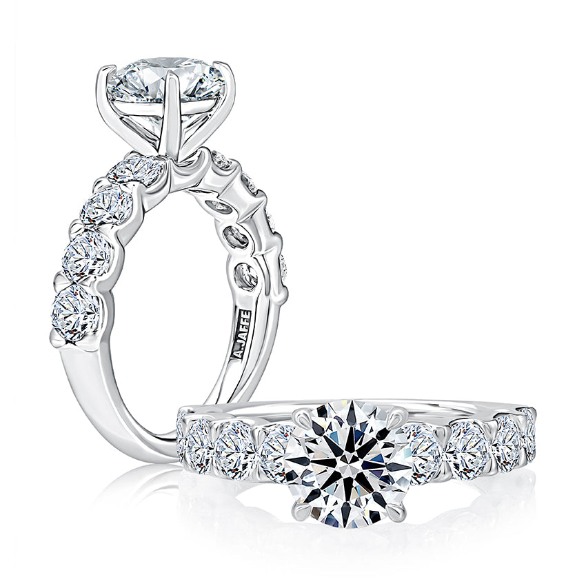 The Four Prongs Round Center Large Melee Diamond Engagement Ring is a classic and timeless beauty. This ring showcases a round center diamond held securely in a four-prong setting, allowing maximum light to enhance its brilliance. The band is adorned with smaller melee diamonds, adding a touch of sparkle and elegance