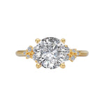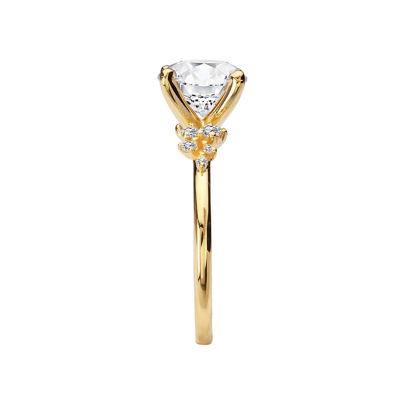 - Accent Diamonds: Clustered round diamonds on either side of the center setting, 1/7 carat total weight