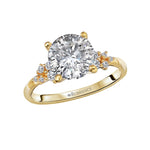 14kt yellow gold semi-mount engagement ring with clusters of round diamonds on either side of a center setting that will accommodate a 8.2mm round diamond. (D 1/7 carat total weight)