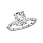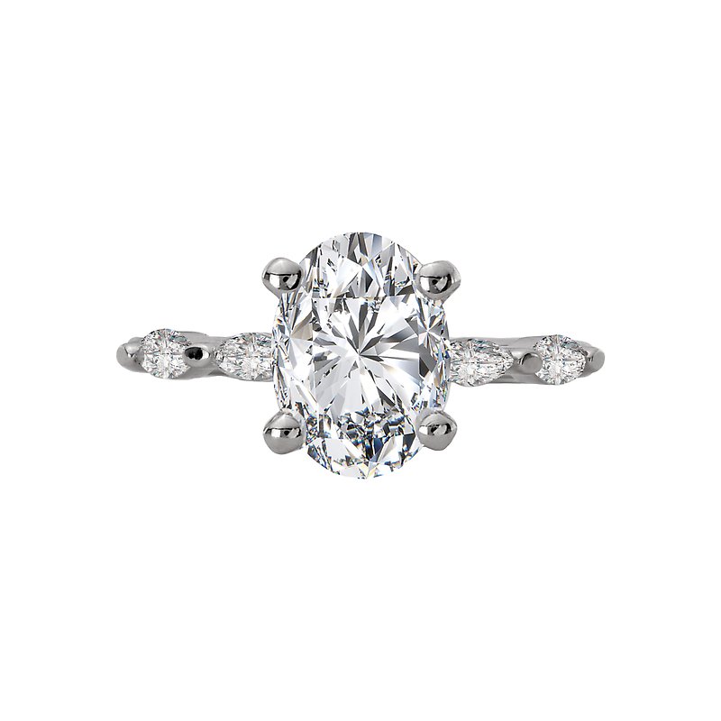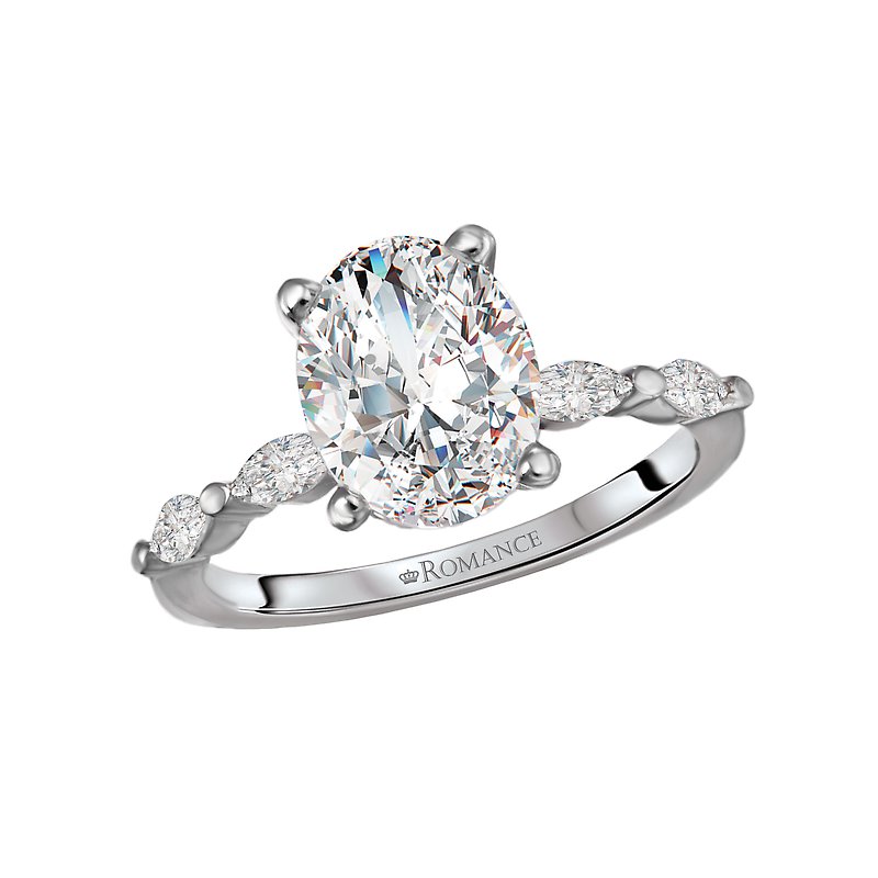 14kt white gold semi-mount engagement ring with marquise diamonds along the band on either side of a center setting that will accommodate a 9.5x7.5mm oval shaped diamond. (D 1/4 carat total weight)