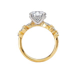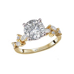 14kt yellow gold semi-mount engagment ring with round and marquise shaped diamonds adorning the shank on either side of a center setting that will accommodate an 8.3mm round diamond. (D 1/2 carat total weight)