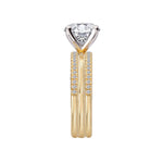 14kt yellow gold semi-mount engagement ring with a split shank that is lined with round diamonds on either side of a center setting that will accommodate a 8.2mm round diamond. (D 1/5 carat total weight)