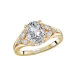 Split shank semi-mount wedding ring crafted in 14kt yellow gold with a trio of marquise and round diamonds on either side of a center setting that will accommodate a 9.5 x 7.5mm oval shaped diamond. (D 1/4 carat total weight)