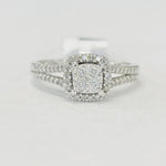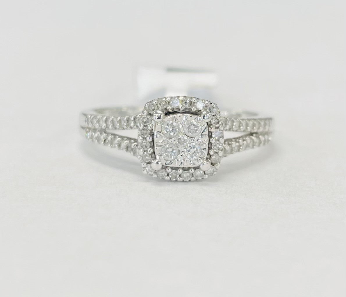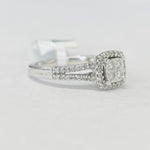 The ring of style and trend is here! Made out of white gold to accent the stunning diamonds this ring features all the in trend styles. With a split and a halo to compliment this ring will make her happier then ever when she sees you on one knee and this ring in hand.