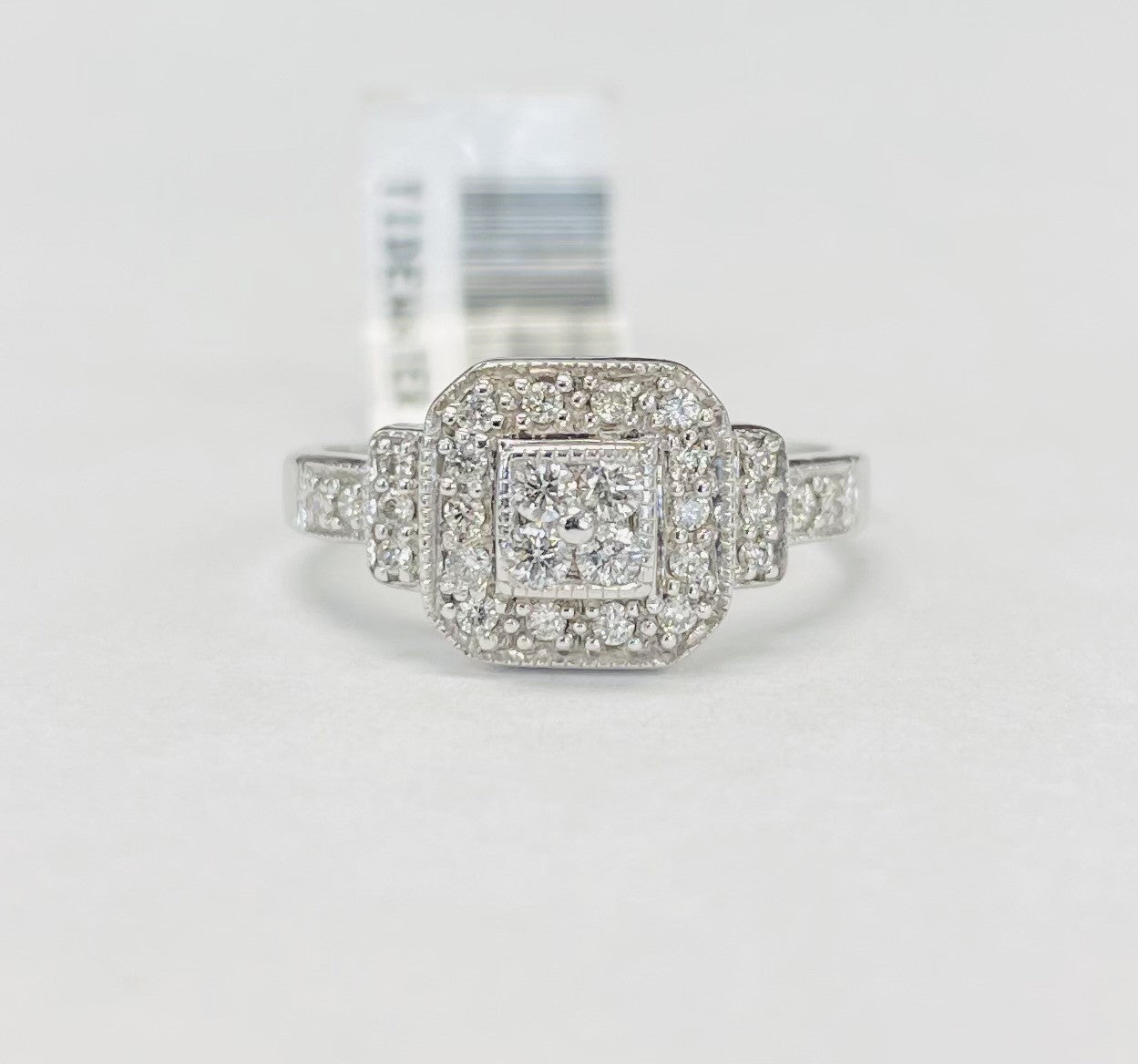 This stunning halo ring features round brilliant diamonds all around. In a square style and a cut cornered halo to accent this ring gives off a big look for a great price.