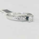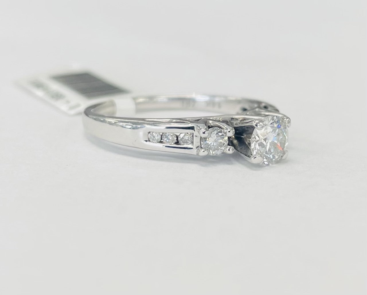 This beautiful three stone ring is made out of stunning white gold! Featuring round brilliant diamonds in the three stone style and channel set diamonds on the side. Made not only with simplicity in mind but also with the beautiful meaning that i will love you forver no matter our past, present, or future.