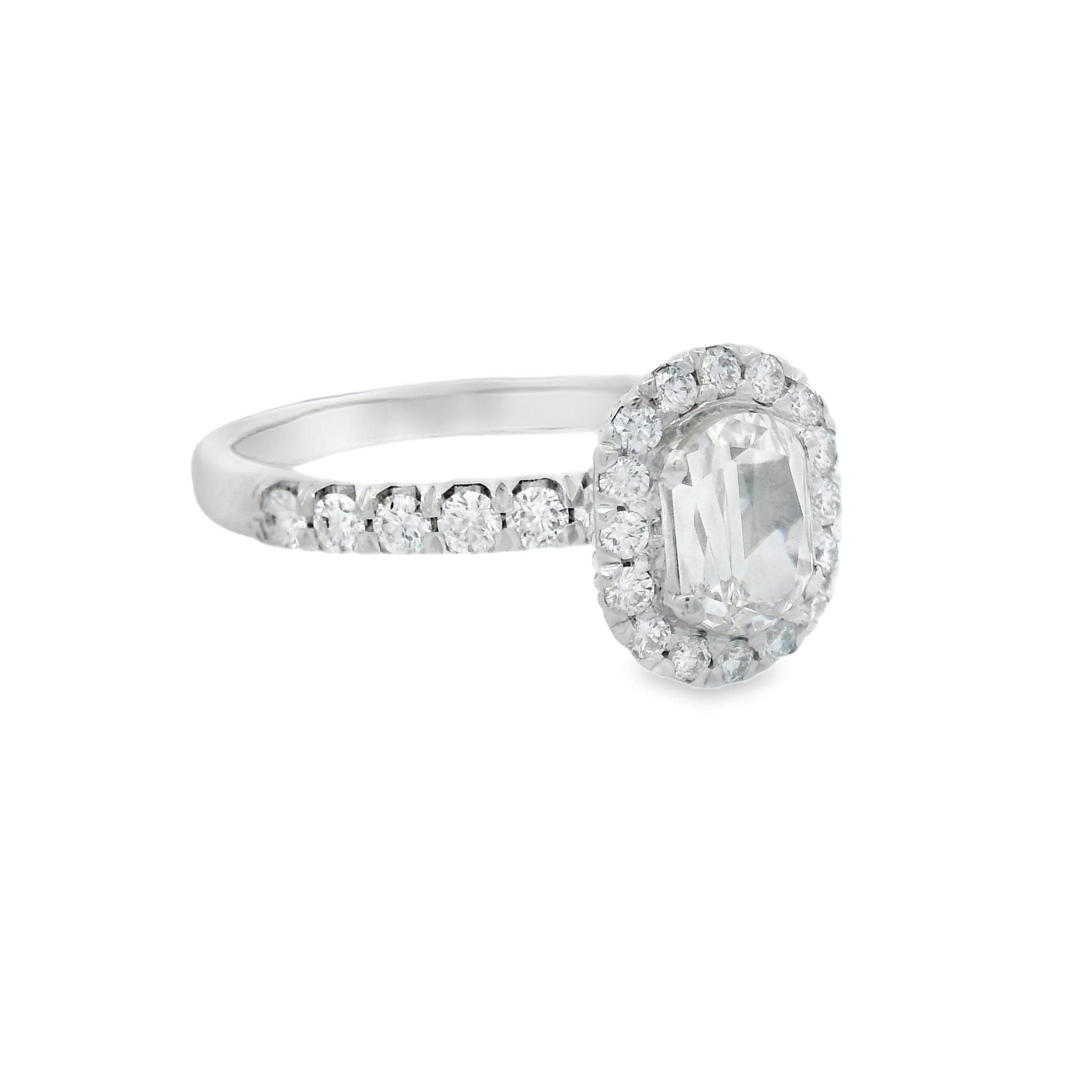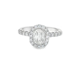 This stunning oval style diamond engagement ring features a criss cut center stone surrounded by a halo of sparkling smaller diamonds. Crafted with precision, the band is adorned with additional diamonds that enhance its elegance. Perfect for making a memorable proposal or celebrating a special occasion.