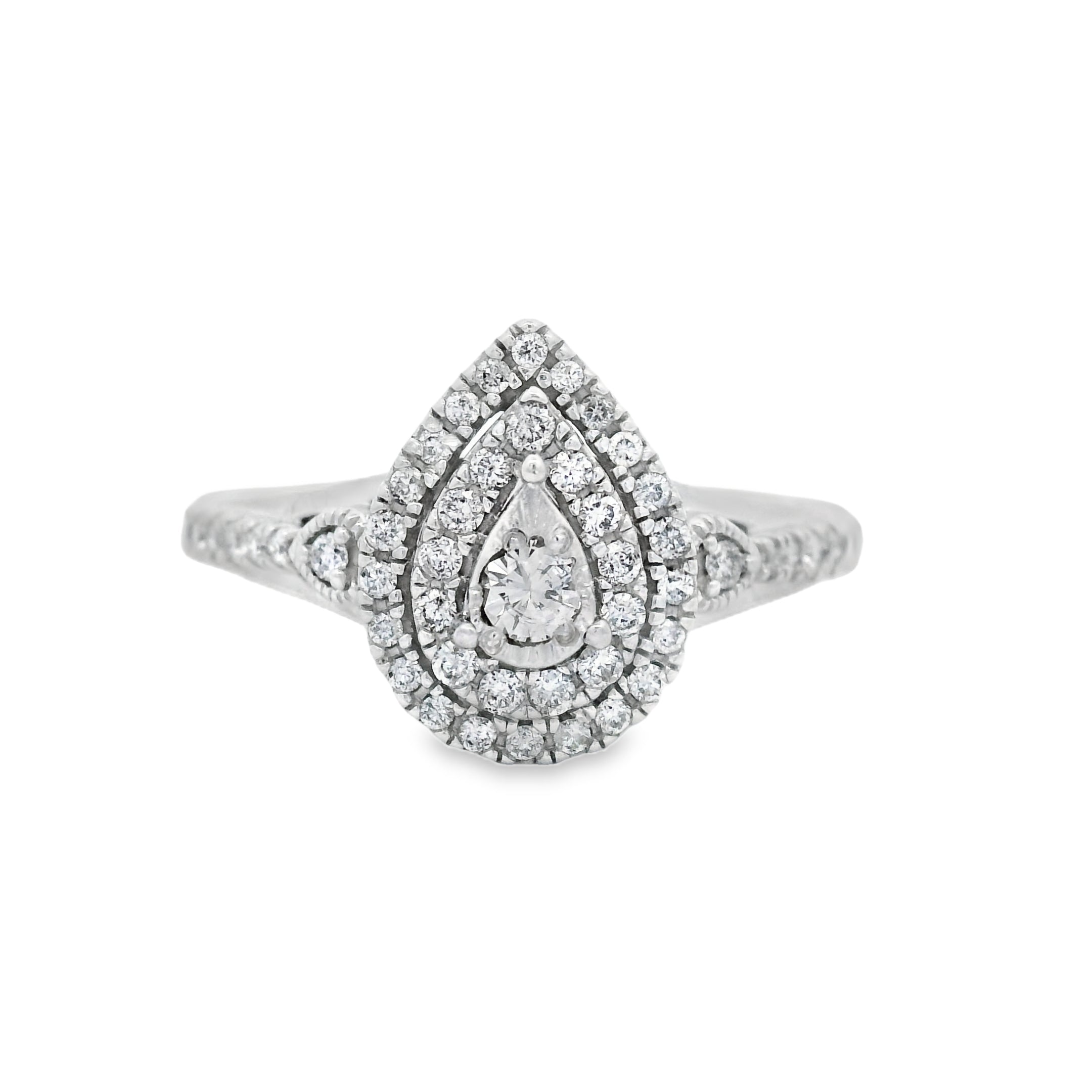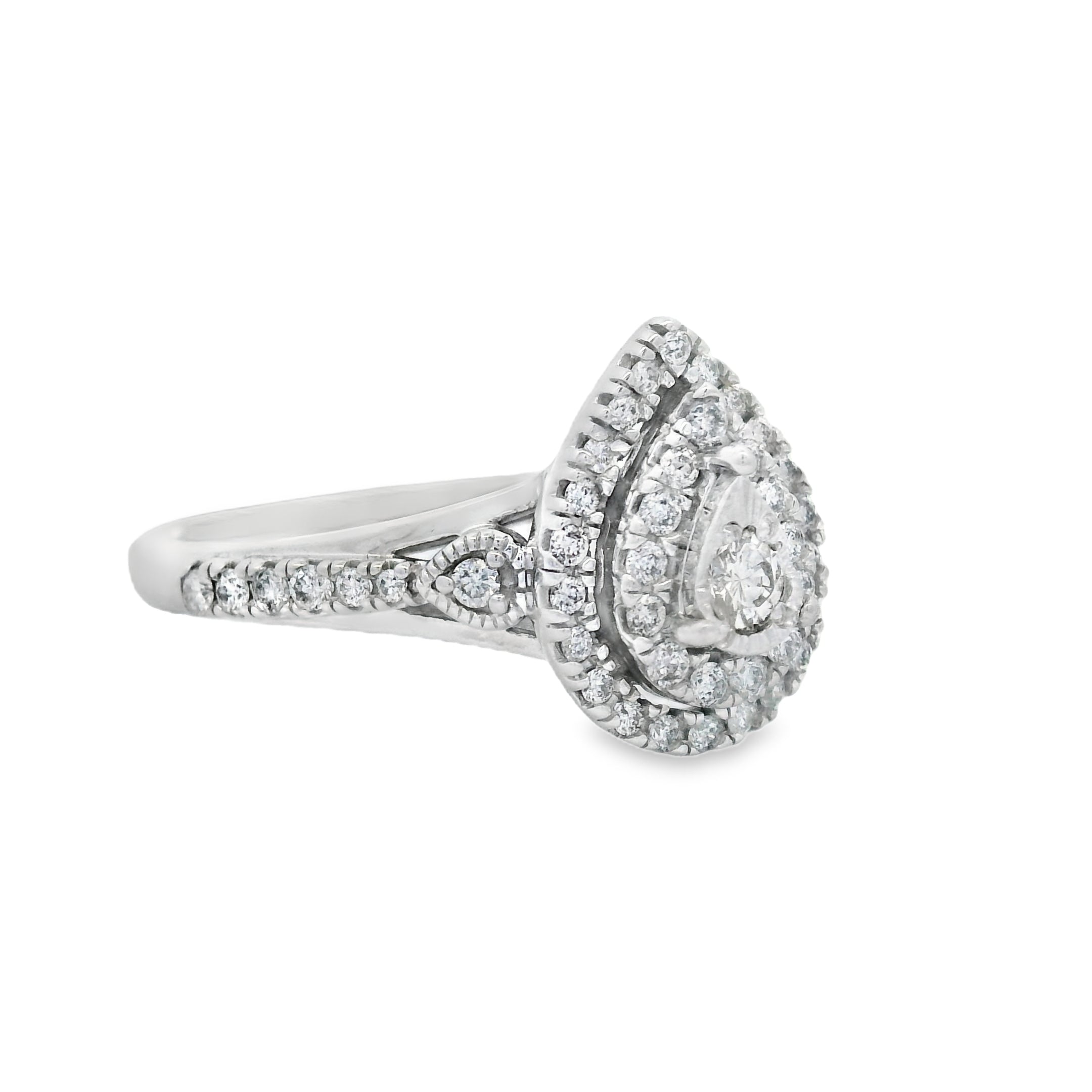 Discover the exquisite beauty of this teardrop diamond ring, designed to capture hearts. The stunning centerpiece is surrounded by a halo of sparkling diamonds, creating a radiant effect that is perfect for any occasion. This ring is not just a piece of jewelry; it's a statement of elegance and sophistication.