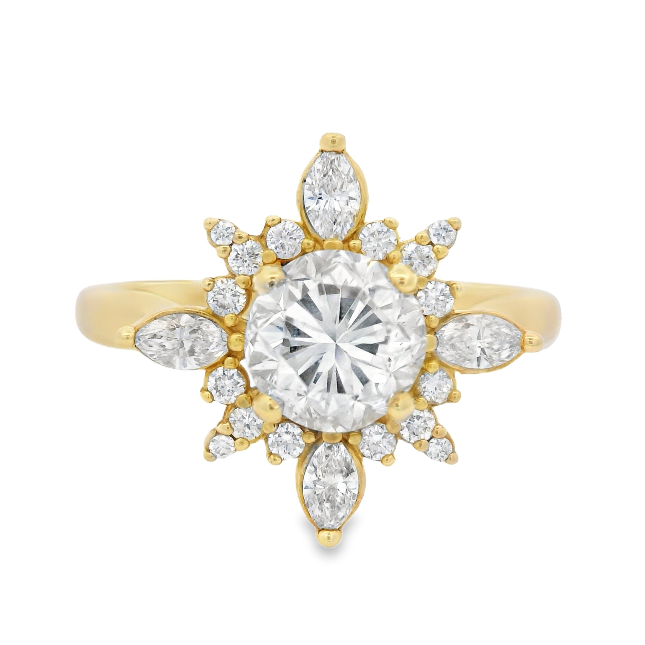 This STUNNING ring shines just like the rays of the sun! Featuring a beautiful 1.26CT certified center diamond and made out of yellow gold to make it pop! Show her she is he light of your life with this amazing ring