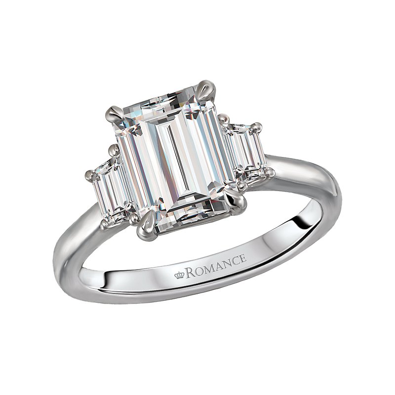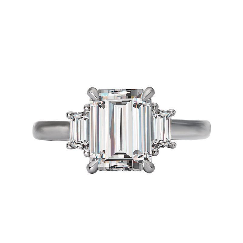 - Style: Emerald-Cut with Trapezoid Side Diamonds