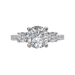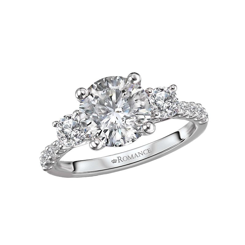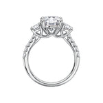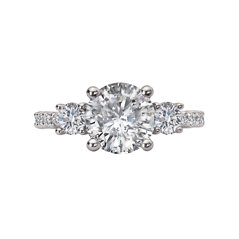 Diamonds line this 14kt white gold band and two round diamonds are set on either side of a center setting that will accommodate a 8.2mm roumd diamond. (D 5/8 carat total weight)