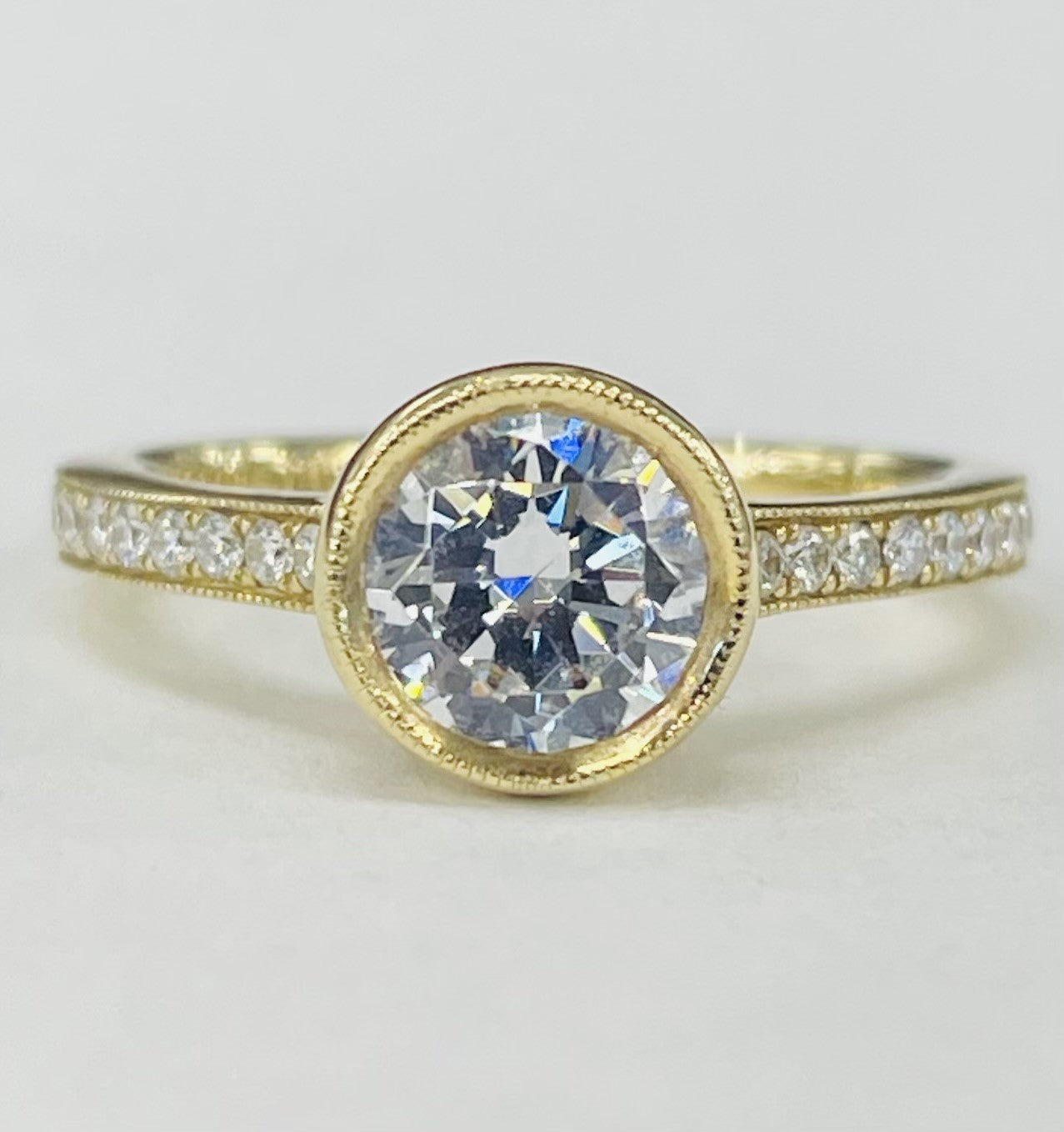 - Setting Style: Bezel Set Round Center with Accented Diamonds