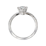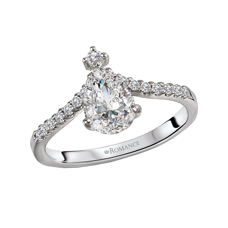 14kt white gold semi-mount diamond ring with a setting that accommodates a 8x5.5mm pear shapped diamond. (D1/7 carat total weight)