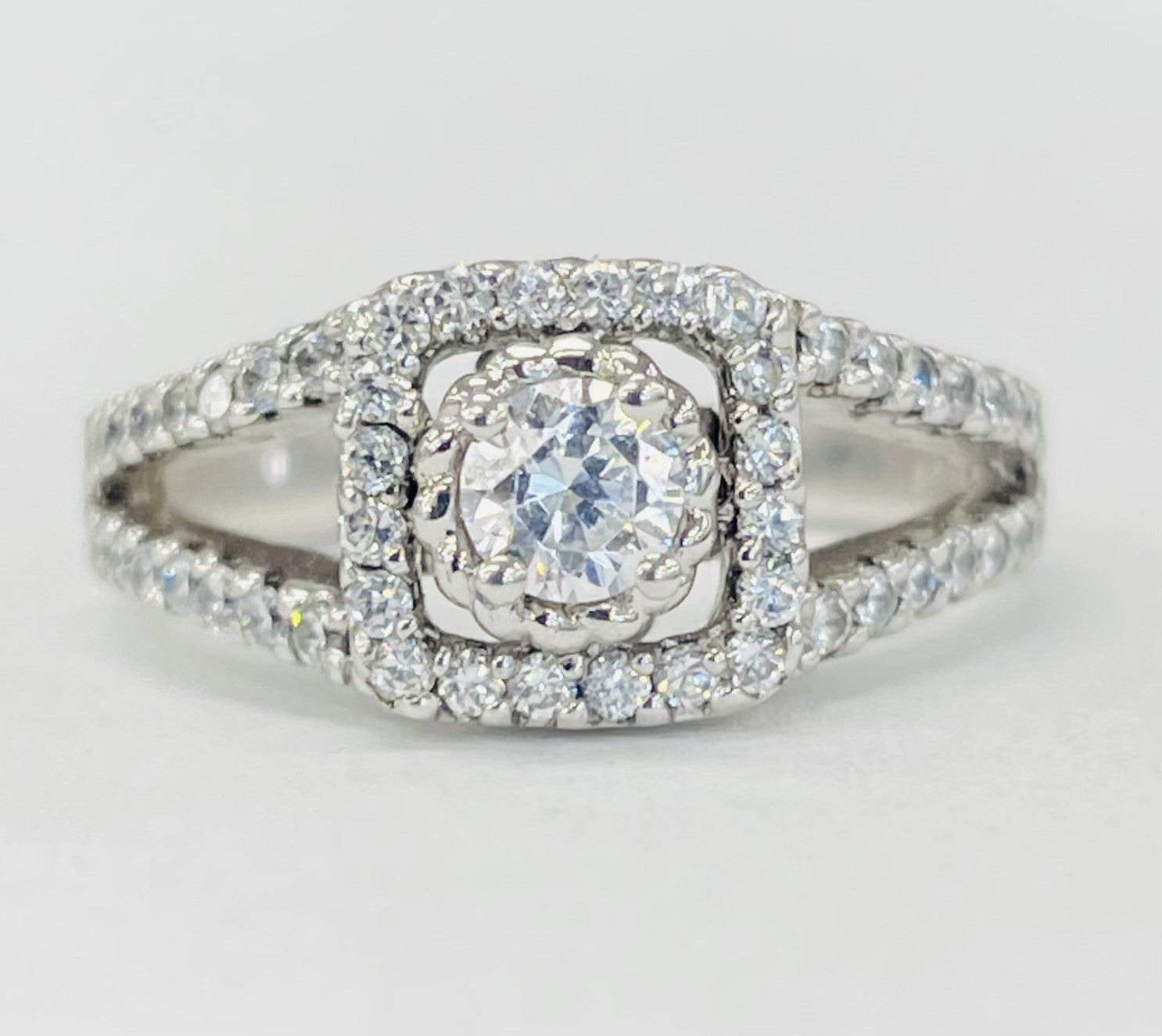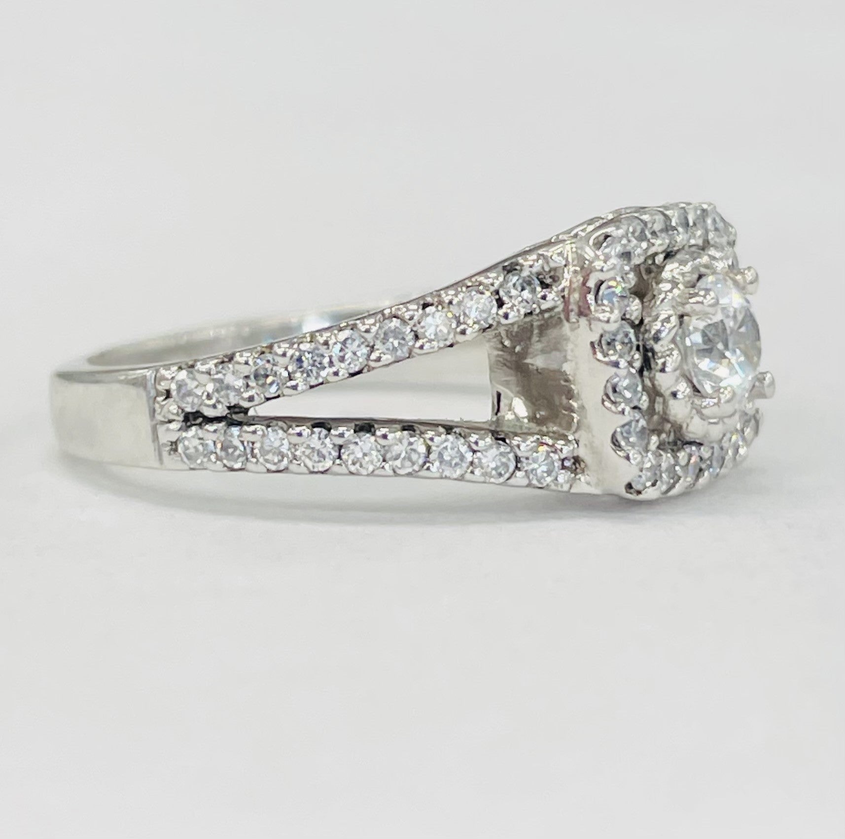 This large split shank setting shows off alot of space. Made out of white gold and a plethra of diamonds this ring is perfect for that modern women in your life.