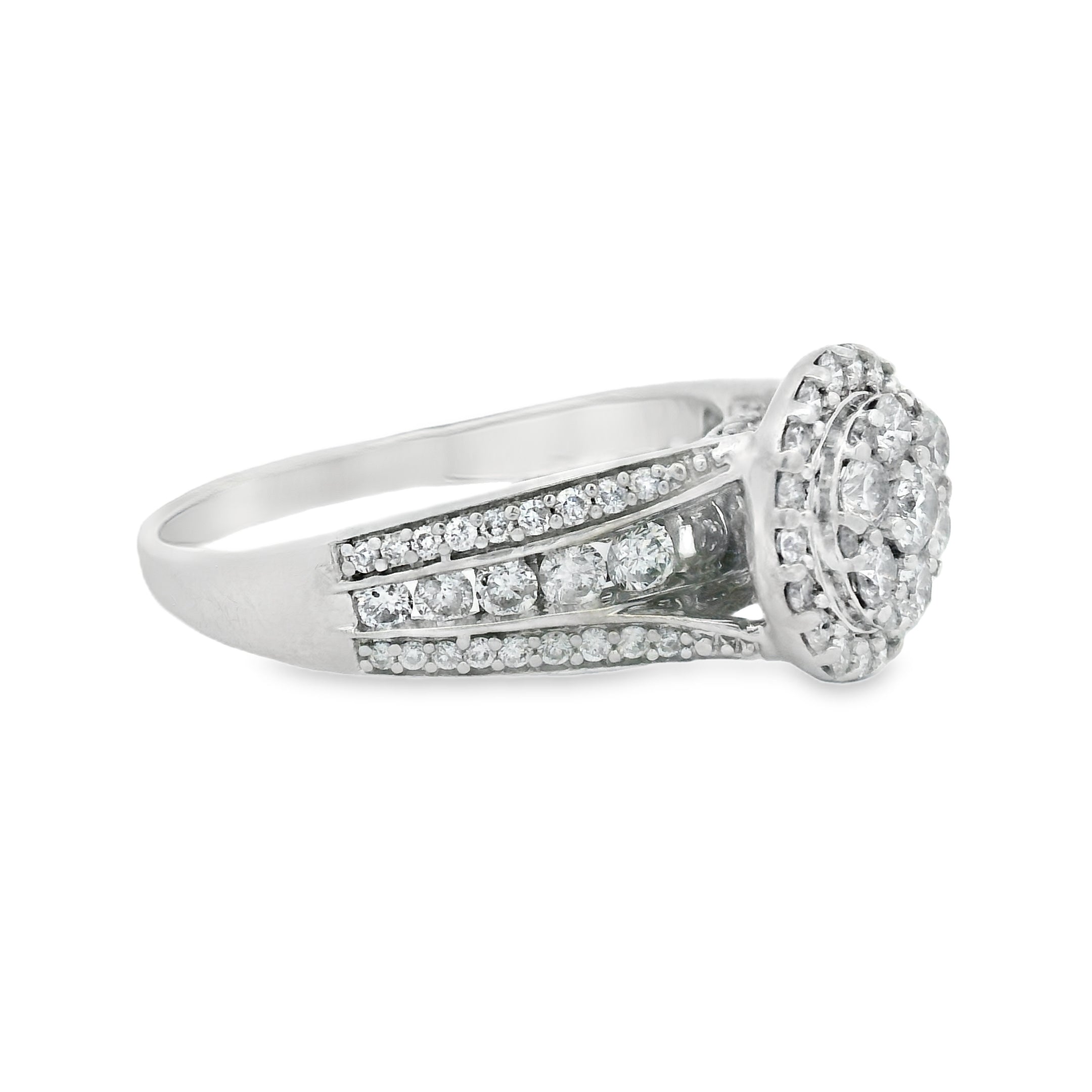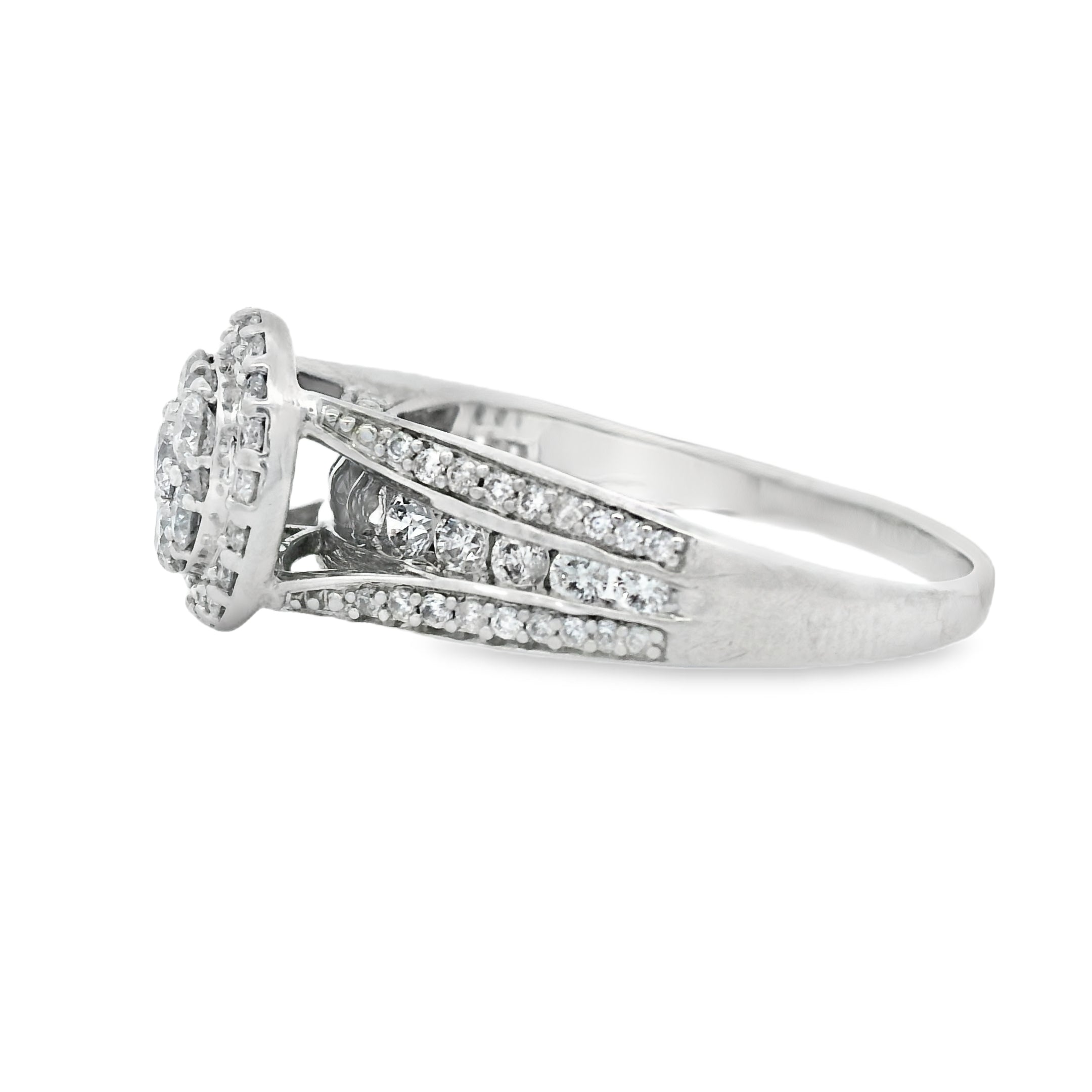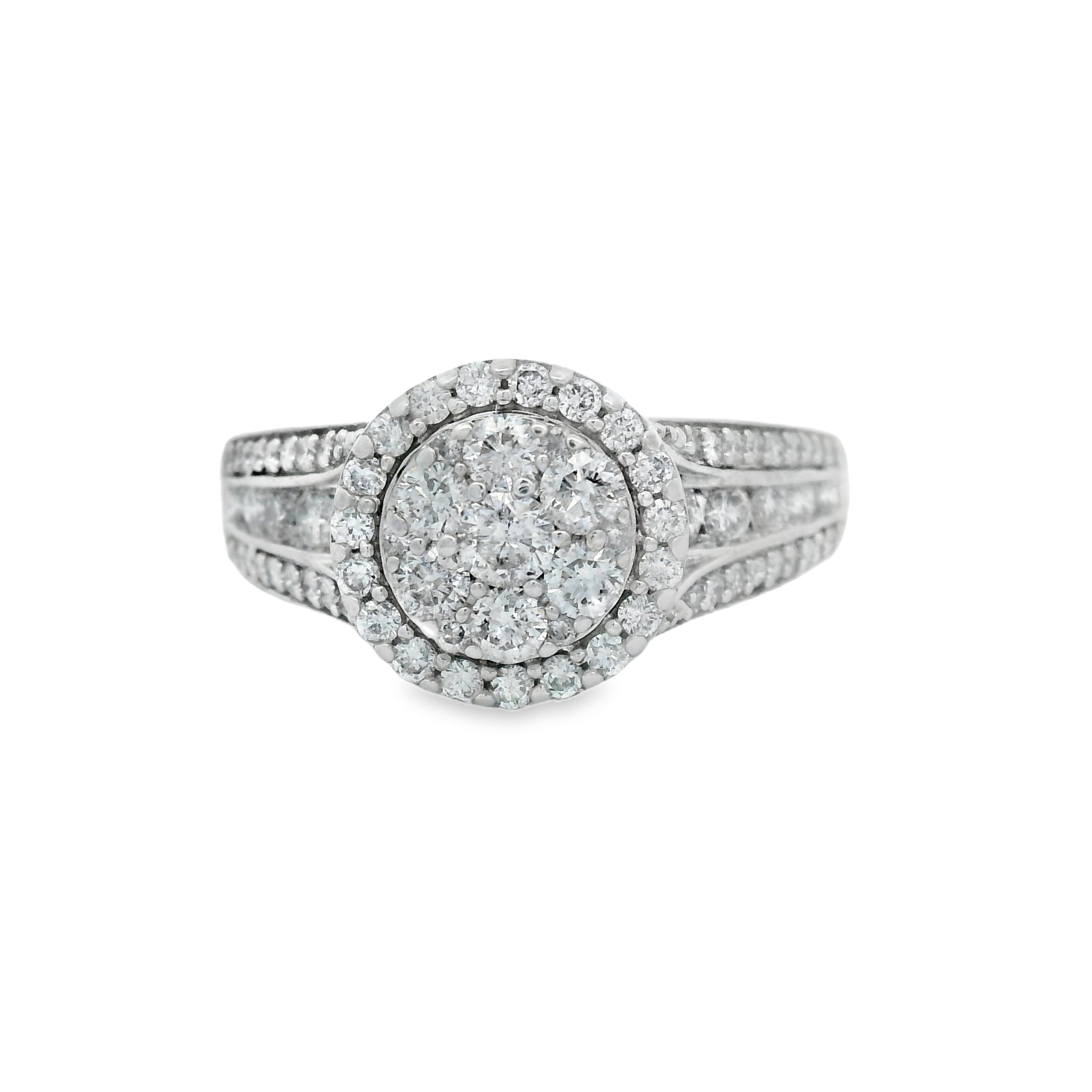 This stunning diamond halo ring features a brilliant centerpiece surrounded by a sparkling array of smaller diamonds. Crafted with precision, it exudes elegance and sophistication, making it the perfect accessory for any special occasion. Whether you're celebrating an engagement or simply treating yourself, this ring is sure to turn heads.