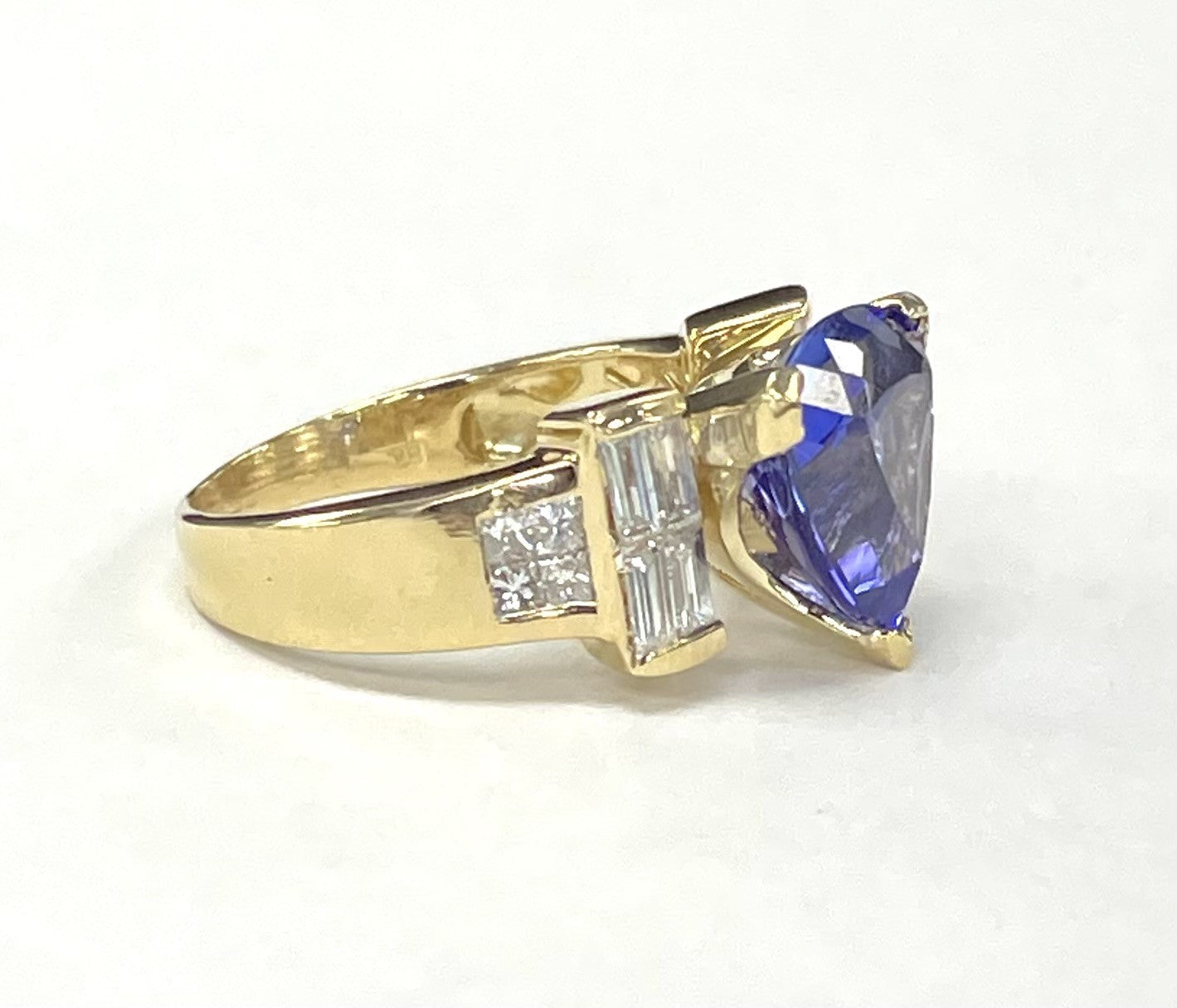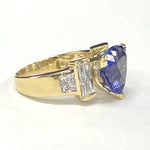 An 18KT yellow gold ring with a 3.07CT trillion tanzanite and diamond inlay, featuring a gold band and a prominent blue tanzanite stone.