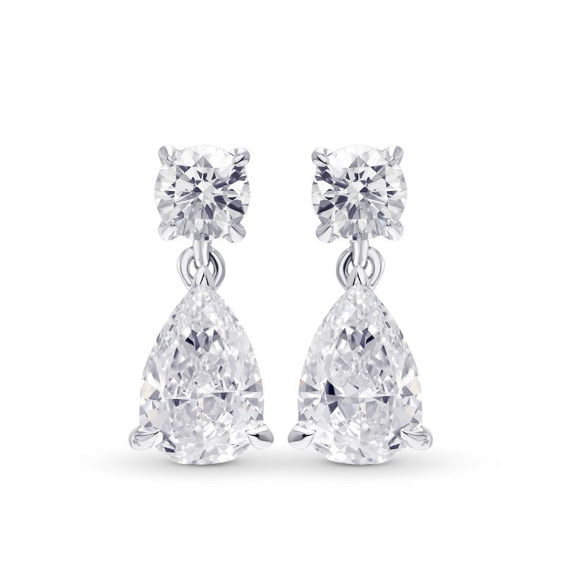 These elgant and stunning earrings are the one all be all earrings. With a modern yet classic style of round and pear shape diamonds these earring are truly one of a kind. Featuring Certified Colorless Pear diamonds these earrings are one for the ages.