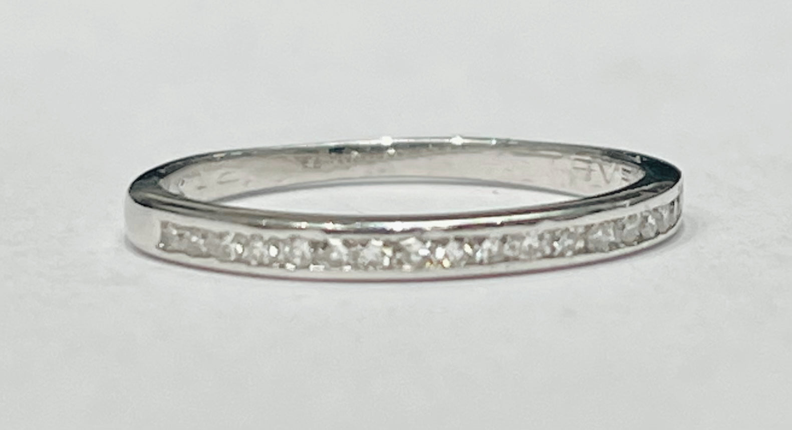 This delicate stackable womens ring features a 14k white gold diamond band. This band will be a channel set with a total of 18 diamonds.