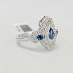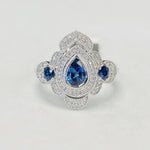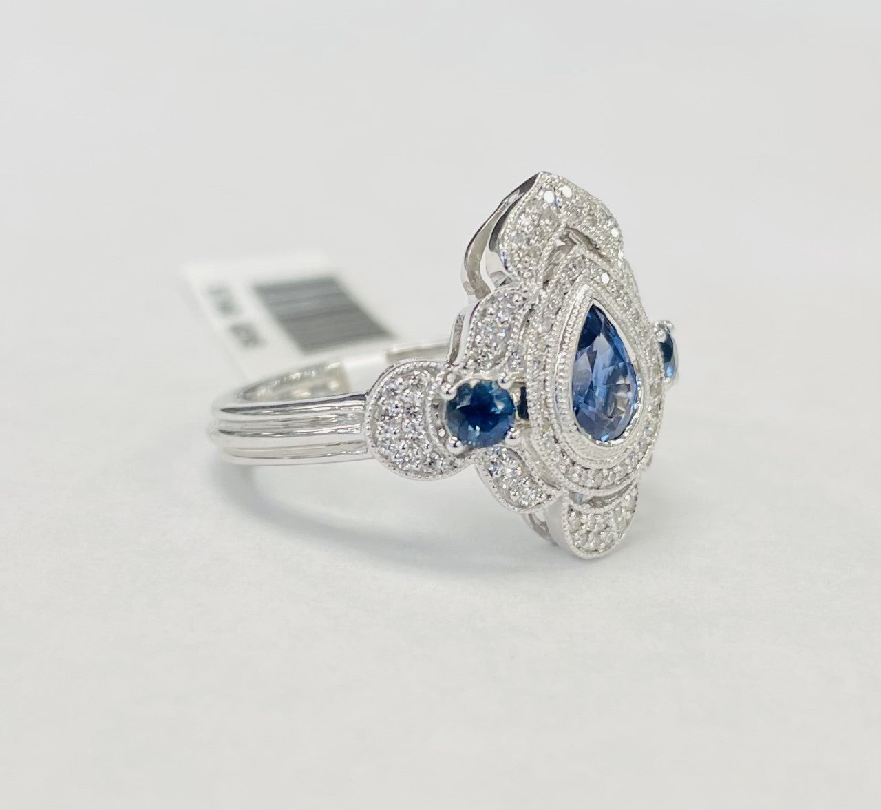This stunning vintage inspired ring features an absoutly mind blowing pear shapped sapphire. Accented by diamonds and more sapphires to elevate the center stone. With millgrain and a vintage pattern style halo and diamond set this ring is guaranted to knock her socks off!
