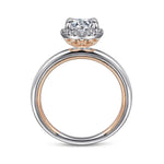 Celebrate your love story with the romantic elegance of the Gabriel & Co. ER16241O6T44JJ engagement ring. Crafted in warm 14K rose gold, this ring features a graceful twisted shank adorned with shimmering pavé-set diamonds that lead the eye to a stunning oval center stone (sold separately). The intertwining band symbolizes two lives woven together, making it a meaningful and stylish choice for your forever moment. With its modern silhouette and vintage-inspired charm, this ring is perfect for the bride who values both tradition and individuality.