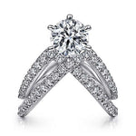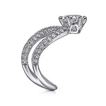 The Gabriel & Co. Atlantis engagement ring (R15013R6W44JJ) is a bold and artistic design crafted in 14K white gold. Its free-form shank flows gracefully around the finger, accented with sparkling pavé diamonds that enhance the brilliance of the round center stone (sold separately). With its sculptural silhouette and modern elegance, the Atlantis ring is perfect for brides who want a distinctive engagement ring that blends creativity with timeless romance.