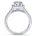 The Gabriel & Co. “Brianna” ER6984W44JJ engagement ring is a romantic and timeless design crafted in 14K white gold. Featuring a round center stone framed by a cushion-shaped halo of sparkling diamonds, this ring delivers brilliance and elegance from every angle. With 0.45 carats of round brilliant diamonds adorning the halo and shank, Brianna offers radiant sparkle with a graceful silhouette. Perfect for brides who appreciate classic beauty with modern craftsmanship, this ring is fully customizable in metal type and center stone size.