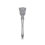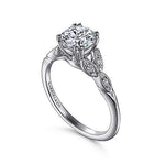 The Celia by Gabriel & Co. is a romantic vintage-inspired engagement ring crafted in luminous 14K white gold. Featuring a split shank design with delicate Victorian-style detailing, this setting beautifully frames your chosen round center stone. Its timeless elegance and intricate craftsmanship make it the perfect choice for brides who dream of a fairytale-inspired ring with modern refinement.