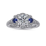 The Gabriel & Co. Chrystie Engagement Ring is a romantic design in 14K white gold, featuring a vivid round sapphire center stone accented by sparkling pavé diamonds along the shank. The deep blue sapphire symbolizes loyalty and elegance, while the diamond accents add brilliance and sophistication. Perfect for brides who desire a distinctive blend of color and timeless artistry, the Chrystie is a stunning heirloom-quality piece.