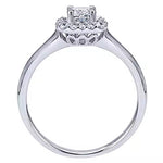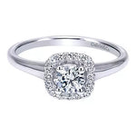 The Courage engagement ring by Gabriel & Co. (ER11928R0W44JJ) is a graceful blend of softness and sparkle. Crafted in polished 14K white gold, this complete ring features a 0.38 ct round center diamond embraced by a softened square halo of accent stones. The clean, high-polish band and delicate proportions make this ring a timeless symbol of love and commitment.