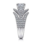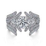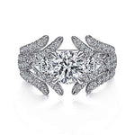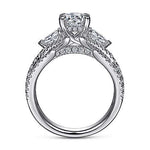 The Gabriel & Co. Daya ER15408R4W44JJ engagement ring embodies romance and elegance. Crafted in luminous 14K white gold, this three-stone design features a round center stone (sold separately) flanked by pear-shaped diamonds, symbolizing past, present, and future love. Crisscrossing pavé diamond strands line the shank, while a curved diamond gallery adds brilliance from every angle. With 1.30 carats of accent diamonds, this ring is a timeless statement of commitment and sophistication.