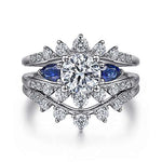 - Design: Round Three-Stone Sapphire and Diamond Engagement Ring