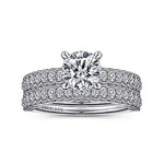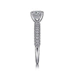The Gabriel & Co. Jacqueline Engagement Ring is a chic and timeless design in 14K white gold, crafted to highlight your handpicked round center stone. Brilliant pavé diamonds line the scalloped shank with delicate milgrain channel detailing, while additional diamonds accent the head of the ring for extra sparkle. This elegant setting blends simplicity with sophistication, making it a perfect choice for brides who appreciate understated luxury.
