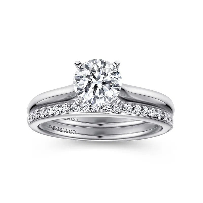 The Gabriel & Co. Lauren ER6684W4JJJ engagement ring is a timeless classic crafted in polished 14K white gold. Featuring a brilliant round-cut center diamond accented by sparkling pave-set diamonds along the shank, this elegant design blends modern sophistication with enduring romance. The sleek silhouette highlights the brilliance of the center stone, making the Lauren ring a perfect choice for brides who appreciate understated luxury and refined craftsmanship.