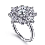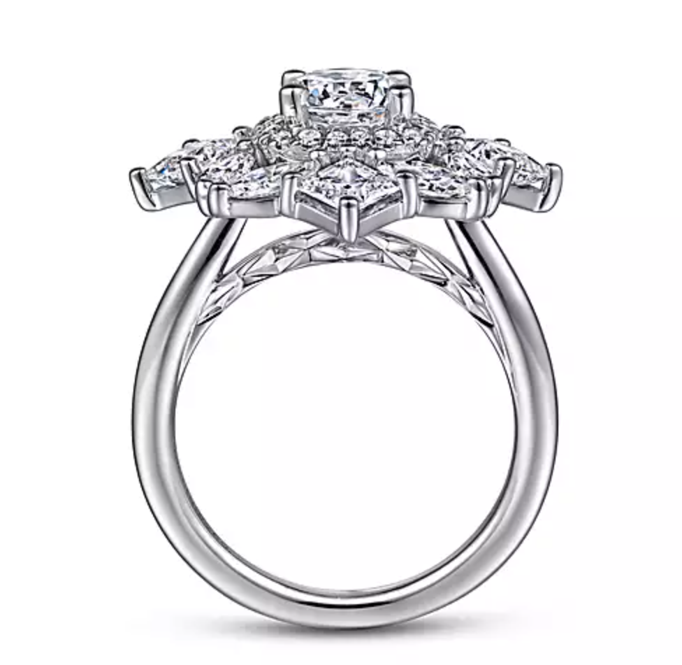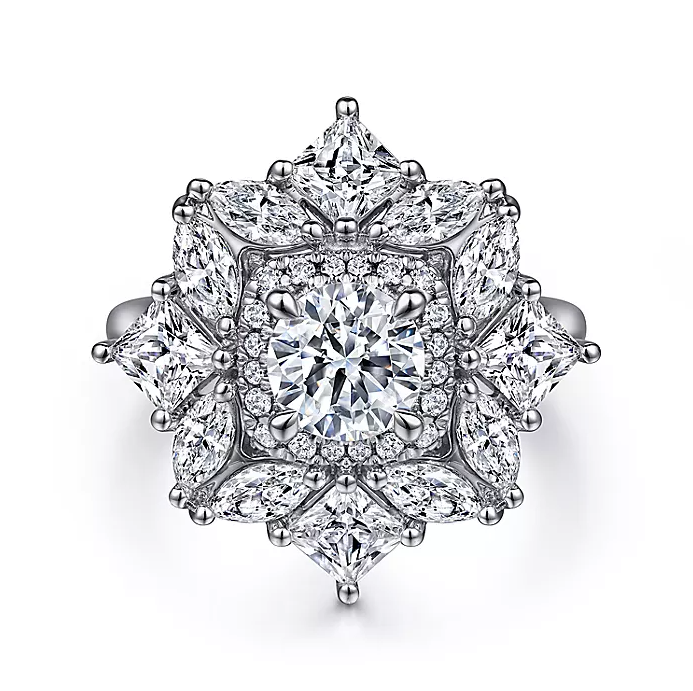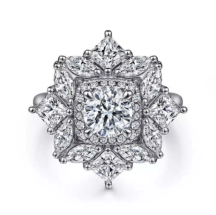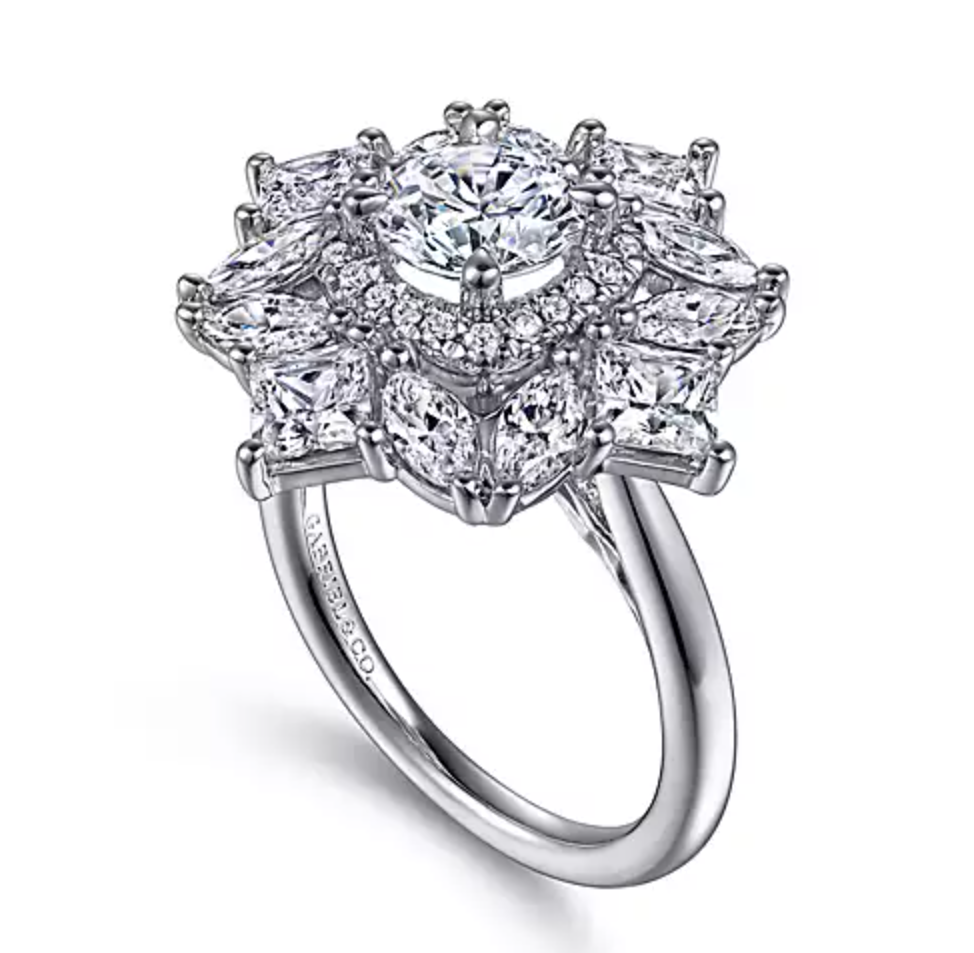 In this one-of-a-kind double halo setting, radiant princess and marquise cut diamonds create the illusion of pretty petals. Smaller accent diamonds form an inner halo directly encircling your 1ct round center stone. Collectively this incredible floral engagement ring shows off 2.41cts of diamonds in a 14K white gold framework.