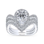 The Gabriel & Co. Madeleine engagement ring (R13661P6W44JJ) is a romantic design crafted in 14K white gold. Featuring a dazzling pear-shaped halo of diamonds surrounding a brilliant pear-shaped center stone (sold separately), this ring offers a graceful silhouette with maximum sparkle. Its pavé-set shank and vintage-inspired detailing make it the perfect choice for brides who want timeless elegance with a distinctive pear-shaped flair.