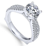 The Marley engagement ring by Gabriel & Co. is a graceful fusion of elegance and artistry. Crafted in polished 14K white gold, this setting features a round center stone embraced by intertwining diamond-accented bands that symbolize unity and everlasting love. The pavé-set diamonds add radiant sparkle, while the sculptural design offers a modern twist on classic romance.
