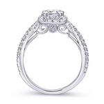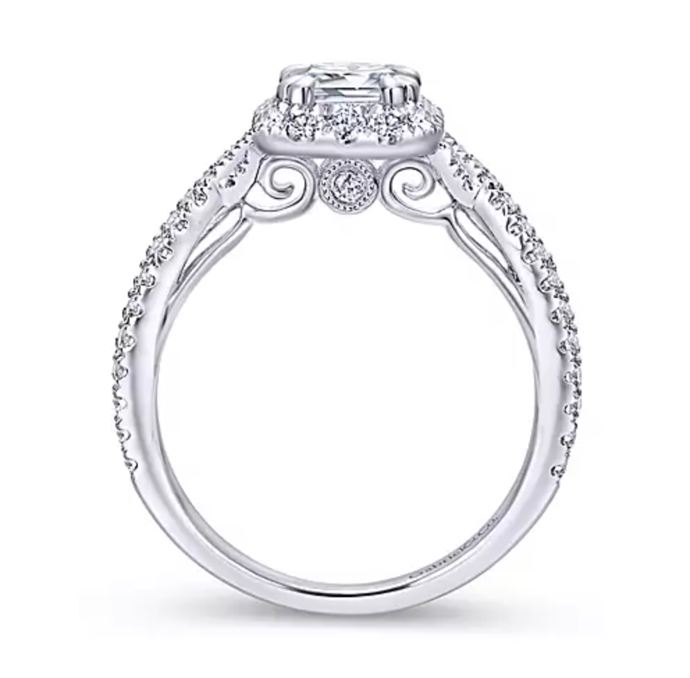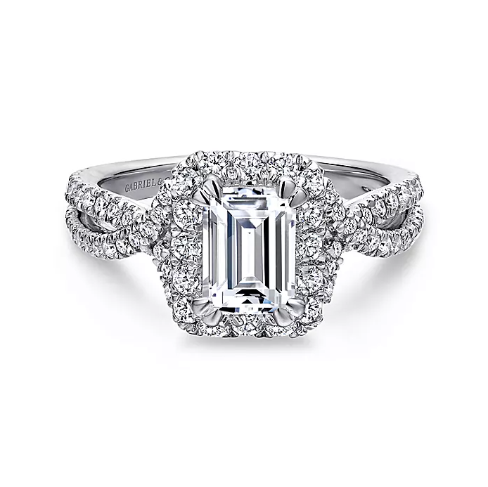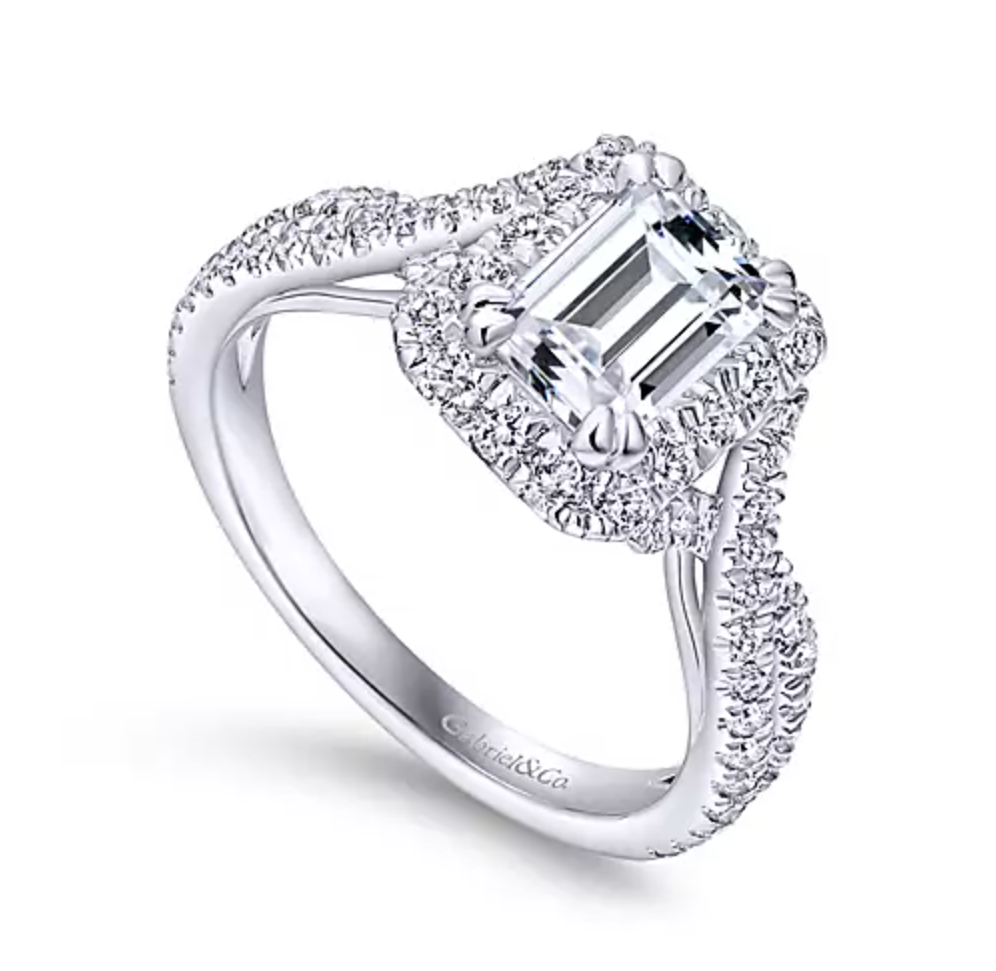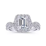 A luxurious pave diamond halo embraces the emerald cut center stone at the heart of this sensational engagement ring. A criss crossing pave diamond band flows seamlessly toward the center stone.