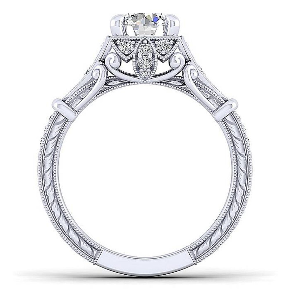 The Gabriel & Co. “Montgomery” ER12581R4W44JJ engagement ring is a distinctive vintage-inspired design that blends old-world charm with modern brilliance. Crafted in 14K white gold, this setting features a round center stone framed by a halo of sparkling diamonds, enhanced by intricate detailing along the shank. With 0.36 carats of round brilliant diamonds, Montgomery offers radiant sparkle with a timeless silhouette. Perfect for brides who appreciate unique craftsmanship and romantic elegance, this ring is fully customizable in metal type and center stone size.