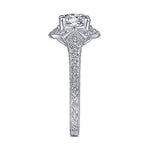 The Gabriel & Co. Providence engagement ring (R14444R4W44JJ) is a striking Art Deco-inspired design crafted in 14K white gold. Featuring a brilliant round center stone (sold separately) surrounded by a geometric halo of sparkling diamonds, this ring blends vintage charm with modern elegance. Its pavé-set shank and bold architectural detailing make the Providence ring perfect for brides who desire timeless sophistication with a unique, heirloom-inspired flair.