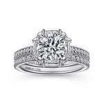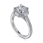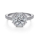 The Gabriel & Co. Ryland engagement ring (R14526R6W83JJ) is a bold, vintage-inspired design crafted in 18k white gold. Its distinctive octagonal halo surrounds a brilliant round center stone (sold separately), accented with a mix of baguette and round diamonds for an art-deco flair. With a diamond-accented shank and intricate detailing, this ring is perfect for brides who want timeless elegance with a unique geometric twist.