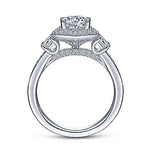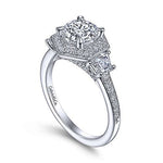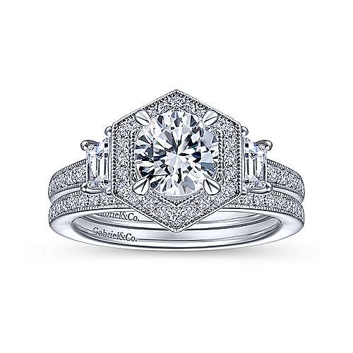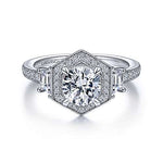 Gabriel & Co. Terza ER15275R4W44JJ – Art Deco 14K White Gold Hexagonal Halo Round Three-Stone Diamond Engagement Ring