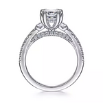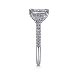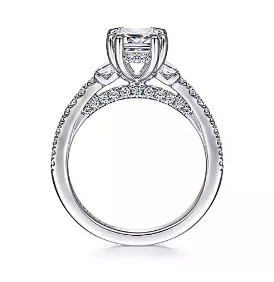 This 3 stone engagement ring designed for an emerald center stone offers clean lines and timeless appeal. In addition to the trapezoid side stones, glistening pavé diamonds flow throughout the slim 18K white gold shank and the curved gallery beneath. Exemplify your love and devotion with this 0.69ct diamond cathedral engagement ring setting.