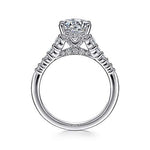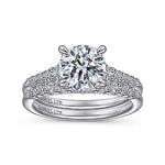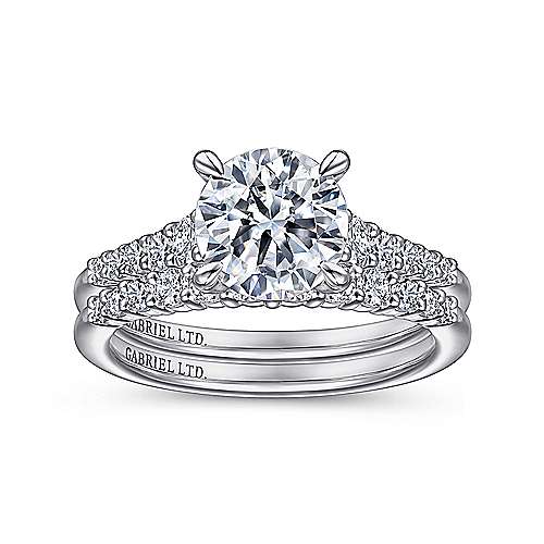 The Gabriel & Co. Wiley engagement ring (R15345R6W83JJ) is a sophisticated design crafted in 18K white gold. Featuring a brilliant round center stone (sold separately), the ring is enhanced with pavé-set diamonds along the shank for added sparkle and elegance. With its timeless silhouette and luxurious metal, the Wiley ring is perfect for brides who desire classic romance with heirloom-inspired refinement.