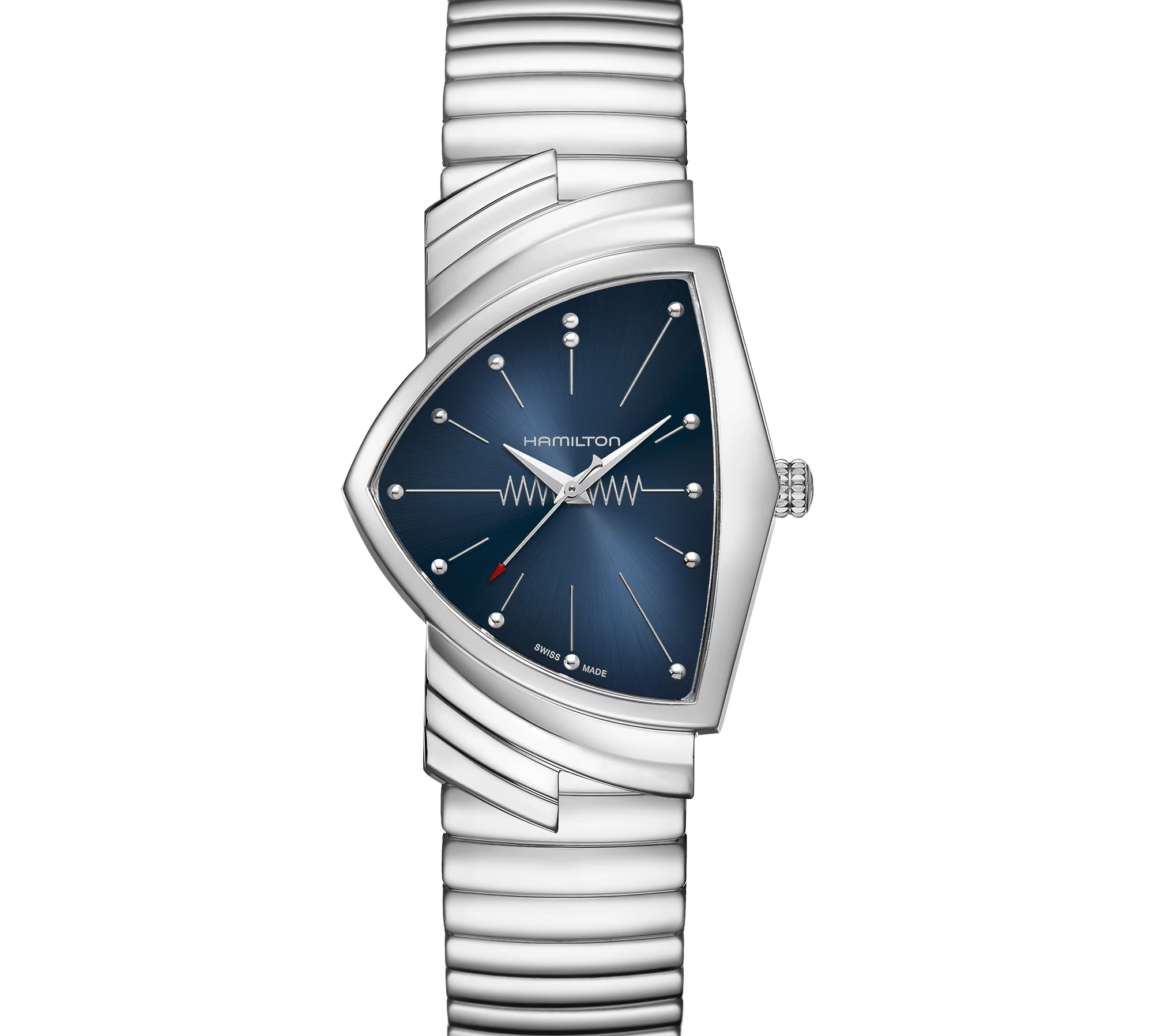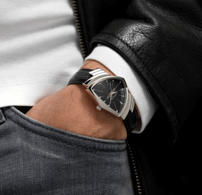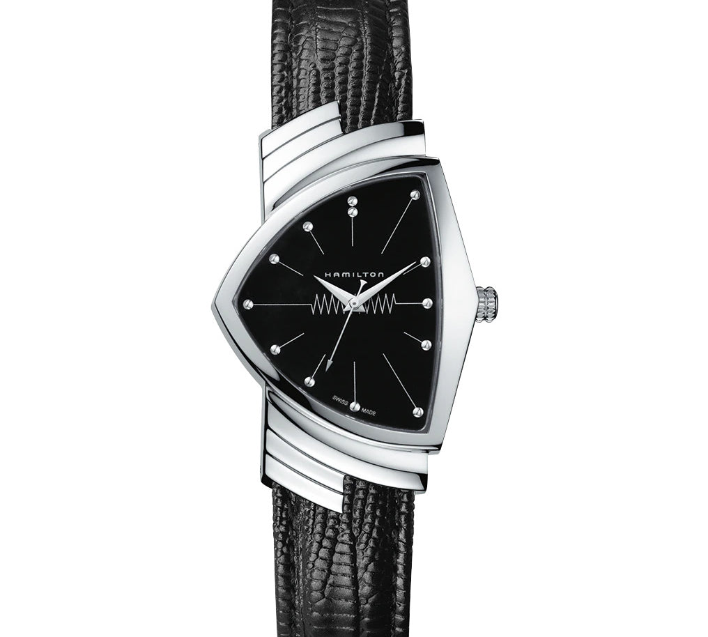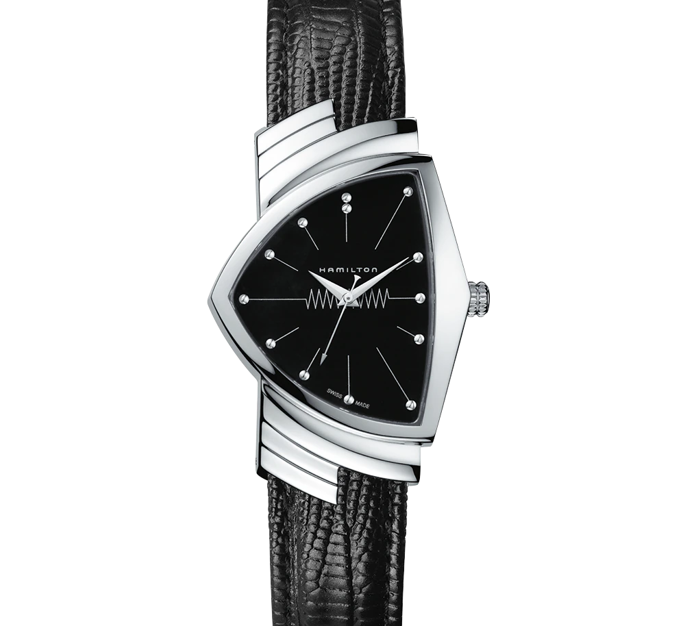 The iconic Ventura features a triangular case, the world's first electric watch design from 1957, blending retro futurism with quartz reliability. Its angular silhouette stands out for bold statements, transitioning from casual to cinematic appeal seen in films like Men in Black. A collector's favorite for its unique shape and Hamilton innovation.