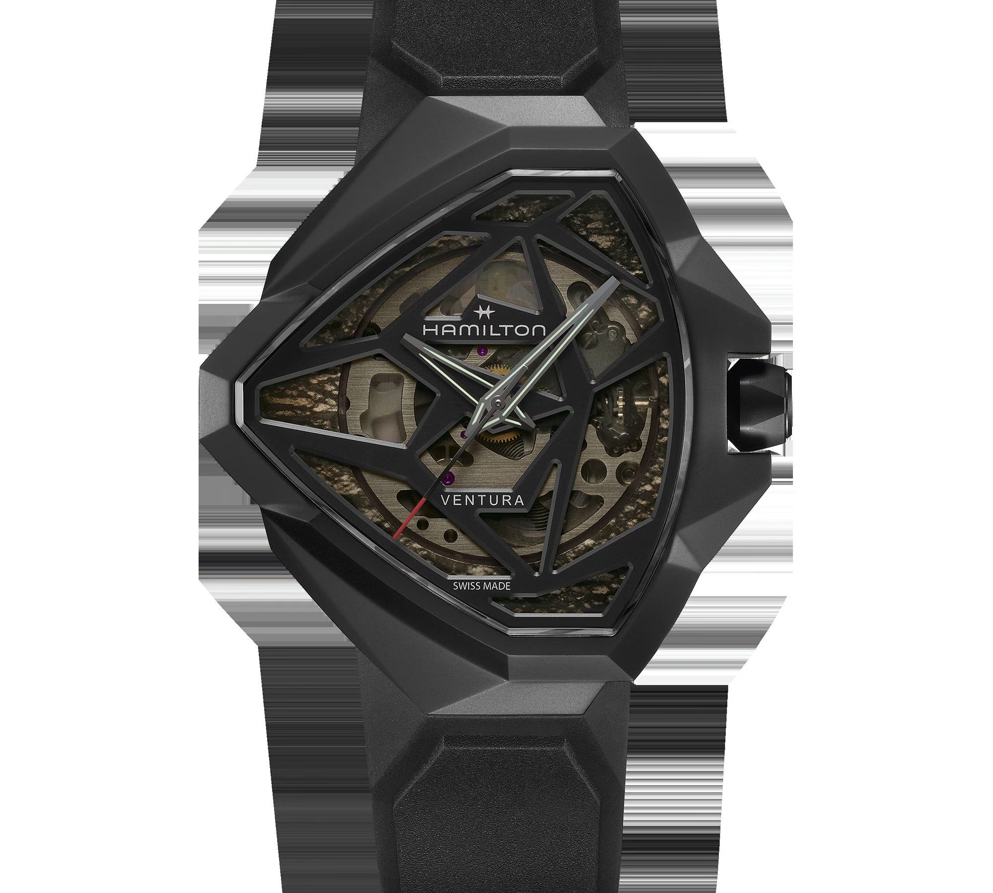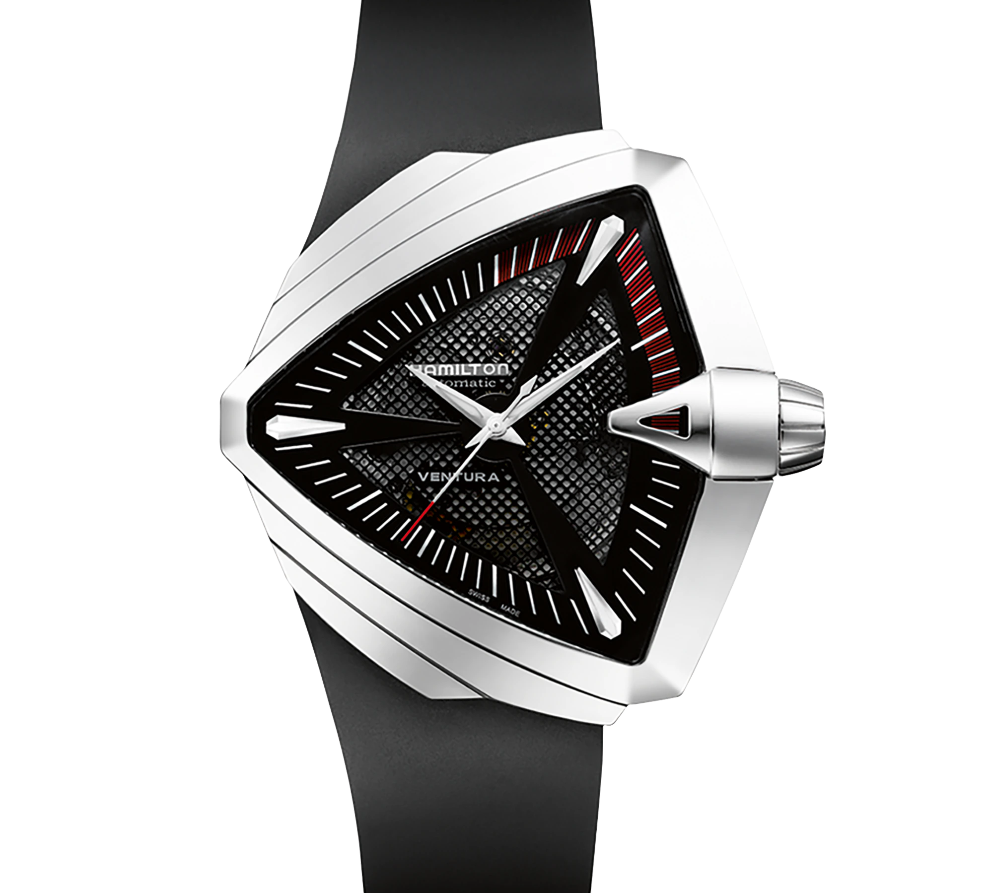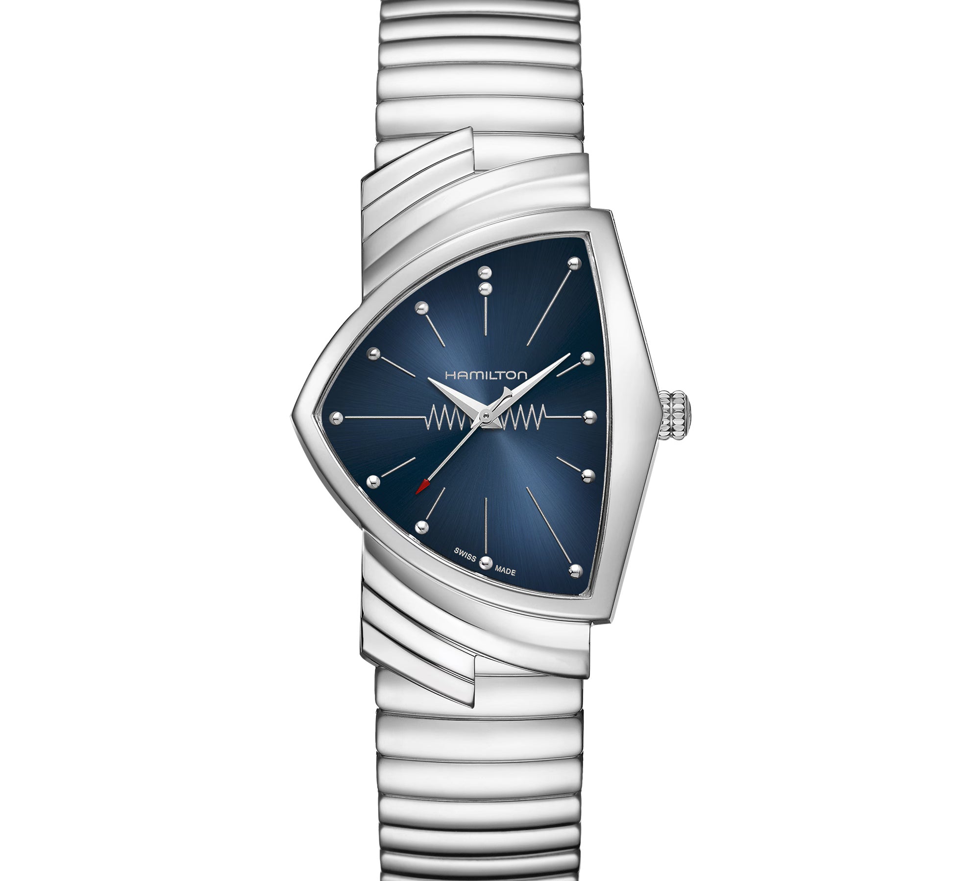 The iconic Ventura features a triangular case, the world's first electric watch design from 1957, blending retro futurism with quartz reliability. Its angular silhouette stands out for bold statements, transitioning from casual to cinematic appeal seen in films like Men in Black. A collector's favorite for its unique shape and Hamilton innovation.