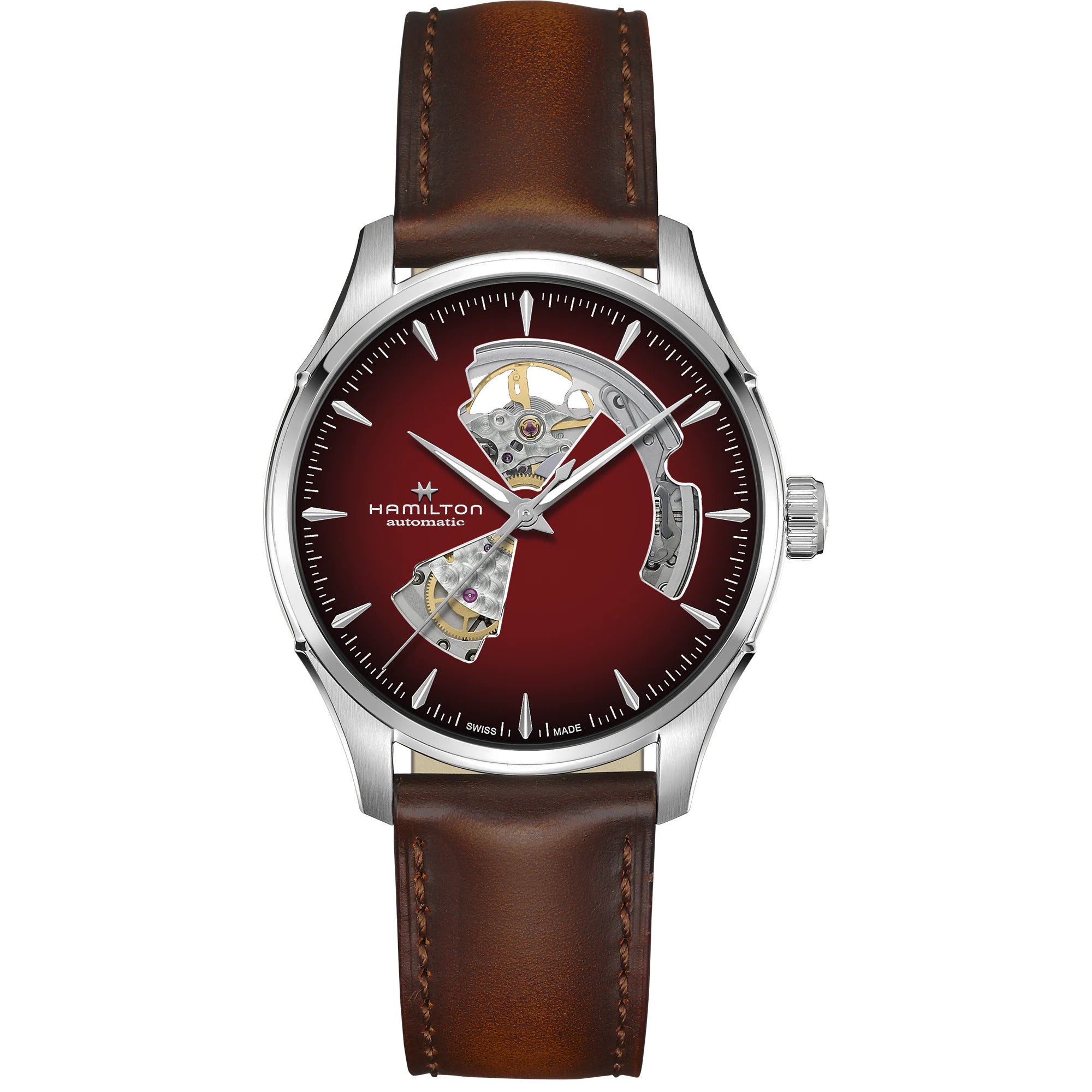 Let precision take center stage with the 40mm Jazzmaster Open Heart and its smoky burgundy cut-out dial, revealing the subtle beauty of this timepiece's inner mechanics. Bringing the H-10-S automatic movement into the spotlight, with an 80 hour power reserve and Nivachron™ balance spring, the Jazzmaster Open Heart is paired with a matching brown smoky leather strap, showcasing Hamilton's ever-evolving craftsmanship and attention to detail.
