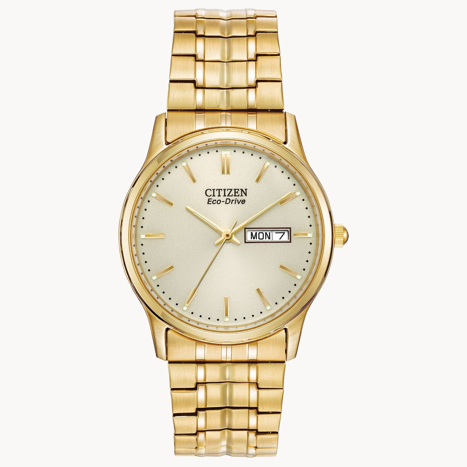 Design and comfort unite in the Citizen Eco-Drive Expansion collection, offering timepieces with universal appeal. Key features of this 3-hand analog watch in stainless steel gold tone include day-date indicator, champagne dial, 36mm case and water resistance. Featuring our Eco-Drive technology – powered by light, any light. Never needs a battery. Caliber number E101.