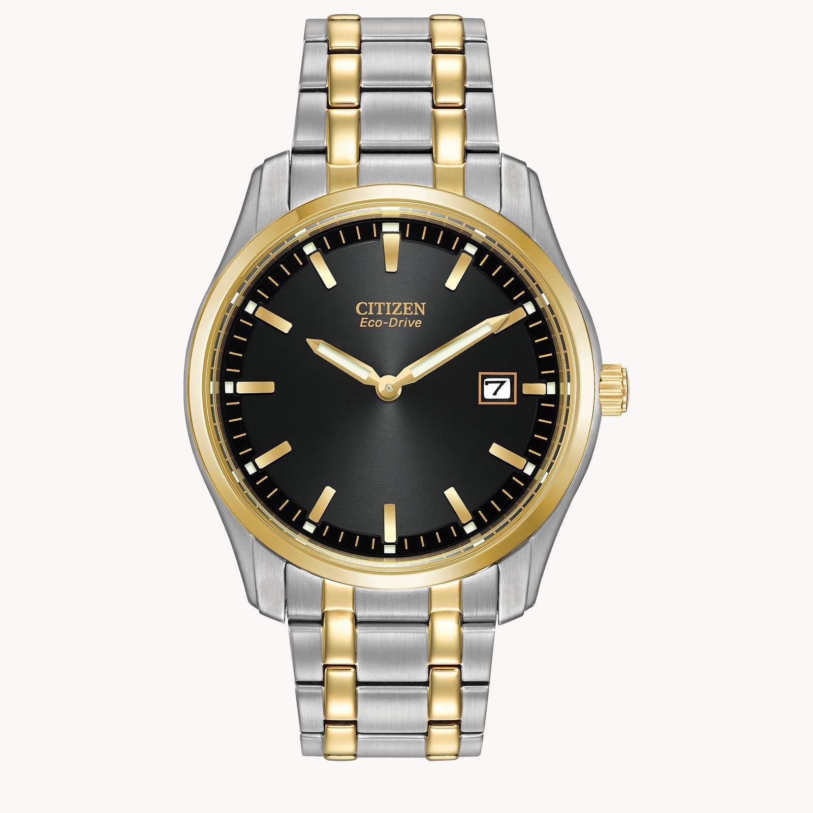 Classic dress is revisited with these new timepieces designed for the man of today. In stainless steel two-tone with a black dial and date feature. Featuring our Eco-Drive technology – powered by light, any light. Never needs a battery. Caliber number J165.