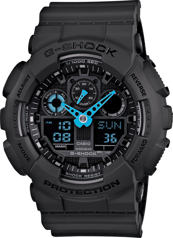 G-Shock’s most popular large case analog/digital series introduces a new color collection, the GA100C’s. Using gray as a base color the band and face, with hands in bright neon blue, makes this watch look cool and sporty in any casual scenes. Gray analog and digital watch with bright neon blue hands.