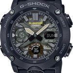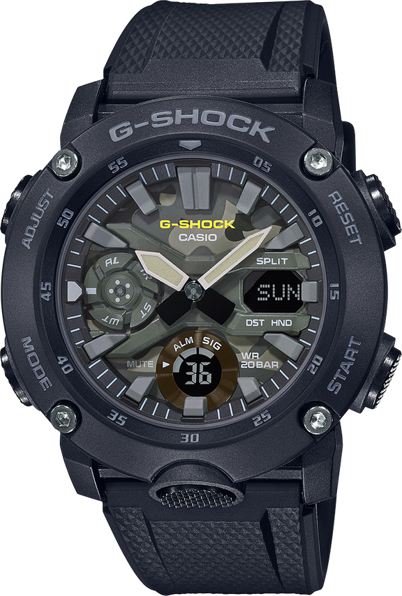 Introducing new Utility Color additions to GA-2000 thin, analog-digital combination line up from G-SHOCK, the watch brand that is constantly setting new standards for unmatched timekeeping toughness.This new model combine practical and utilitarian colors of the bezels, faces, and bands that go well with street fashions, to create distinctive looks that fit right in with a wide range of fashions and activities. The camouflage pattern printed on the bezel of the GA-2000SU model. Carbon Core Guard Base, Shock Resistant, 200M Water Resistant.